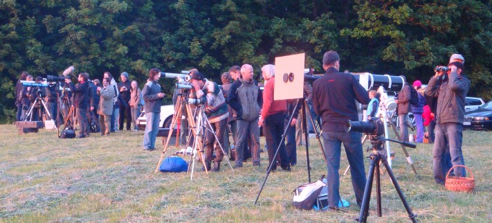 Am liebsten wäre der Zwerg ja mitgekommen, aber so früh aufzustehen, wollten wir ihm dann doch nicht zumuten. So machte ich mich mit unserem Newton auf den Weg zum -von der Volkssternwarte Urania Jena– vorgeschlagenen Treffpunkt. Freie Sicht nach Osten und überraschend viele Frühaufsteher mit und ohne optische Hilfsmittel empfingen mich dort bereits. Schnell das Teleskop aufgebaut, ausgerichtet und schon bald wurde es über den Baumwipfeln in der Ferne heller und heller. Während bereits nur ein Teil der Sonne zum Vorschein kam, war der ersehnte schwarze Fleck deutlich zu sehen. Die „dunkle Seite“ der Venus.