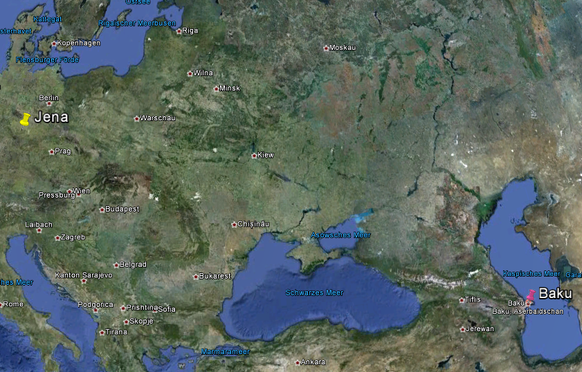 Jena und Baku liegen ungefähr 3150 km Luftlinie voneinander entfernt. Dabei befindet sich Baku etwa 1150 km (10°) südlicher und 3000 km (38°) östlicher als Jena. Doch was heisst das für den Sternenhimmel?