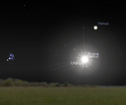 Aus Anlass einer sehr schönen Stellung der Planeten melden wir uns heute mal wieder. Nicht nur, dass Merkur mal wieder vor der Sonne entlang zieht, nein, auch Venus und der nun unsichtbare Uranus in der selben Richtung.