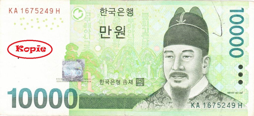 Hallo ich bin Pickachu und für euch immer auf der Suche nach interessanten Neuigkeiten. Außerdem liebe ich Geld. Ich zähle es, ich sortiere es und ich schau es mir an. Besonders gerne natürlich Geld aus anderen Ländern. Dabei ist mir ein 10.000 Won Schein zwischen die Finger gekommen. Der kommt aus Süd-Korea und ist ungefähr 7 Euro wert.