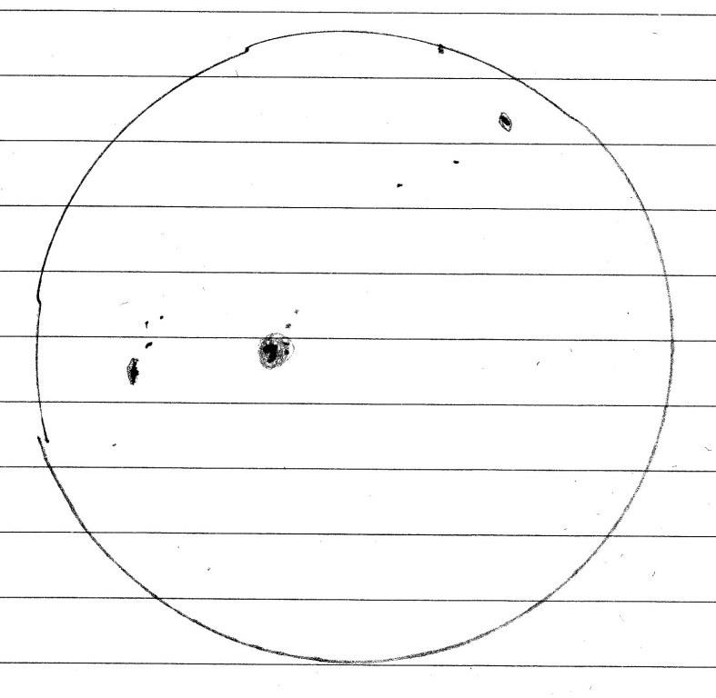 Am Nachmittag schien die Sonne am leicht wolkigen Himmel und so hatten wir nach langer Zeit mal wieder Lust Sonnenflecken zu suchen. Also, unser 114/900 Newton Teleskop auf die Terrasse gestellt, Sonnenfolie vor die Öffnung und Sonne „suchen“. Naja, durch die Sonnenfolie kommt fast kein Licht durch; aber ohne geht gar nicht. Viel zu gefährlich!!! Und da war die Sonne mit ihren die Flecken auch schon. Wir haben mal versucht, sie zu zeichnen. Das geht viel schwerer als man denkt.