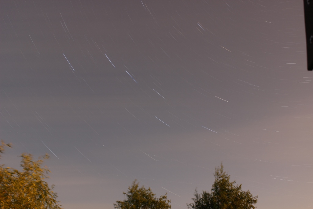 Weil das mit dem Fotografieren so gut klappte, haben wir noch etwas weiter gemacht. Erst mal eine sogenannte Strichspuraufnahme. Hierbei wird für etliche Minuten die selbe Stelle fotografiert. Durch die Drehung der Erde bewegen sich die Sterne in dem Bild und hinterlassen so einen hellen Streifen. Je weiter die Sterne vom Polarstern weg sind, umso länger ist der Streifen.