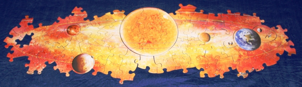 Vor Kurzem haben wir als Mitbringsel aus den USA ein Sonnensystem bekommen. Sonne – Erde – Planeten – und noch mehr, … – alles dabei. Nur Zusammensetzen mussten wir es noch selber. OK, es hat nicht die Größe von mehreren astronomischen Einheiten, aber besteht zumindest aus 500 Einzelteilen, die alle verschieden geformt sind. Ja richtig – ein Puzzle.