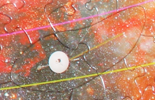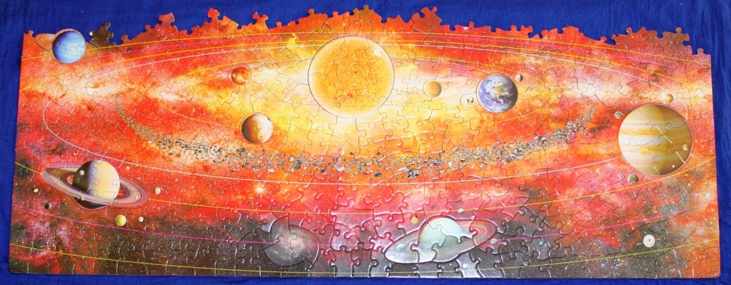Jetzt wird es richtig schwierig. Im oberen Bereich sind jetzt nur noch rötlich bis schwarze Puzzleteile mit Sternen, Sternen, Sternen. Dazwischen noch der Halleysche Komet, die Andromedagalaxie, der planetarische Nebel NGC 2818 und der Komet 73P Schwassmann-Wachmann. Doch nachdem alle Teile an der richtigen Stelle sind, haben wir das Sonnensystem in der Größe 92 cm x 46 cm (36″x 18″) vor uns.