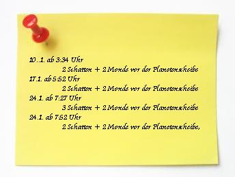 - Die um den Planeten kreisenden Monde sind meistens als kleine, helle Punkte neben dem Jupiter zu sehen. Manchmal sieht man sie jedoch auch nicht (wenn sie hinter dem Planeten sind) oder man sieht sie vor ihm. Dann können auch ihre Schatten zu erkennen sein. Im Januar sind an folgenden Tagen Monde und Schatten „auf“ Jupiter zu sehen