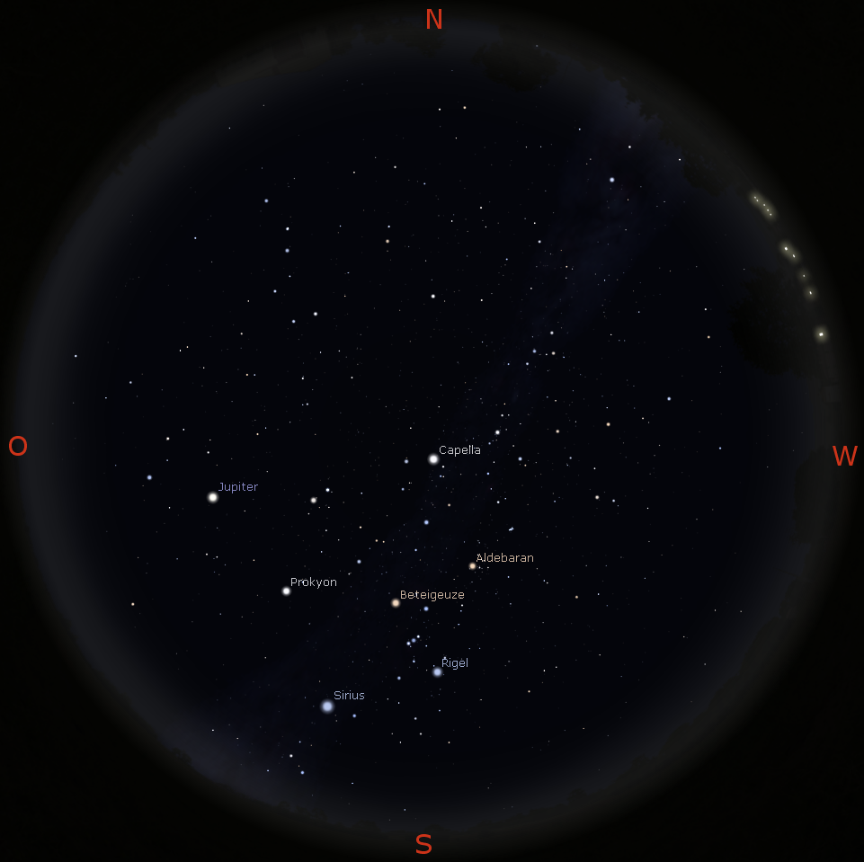 - die Wintersternbilder Orion, Fuhrmann, Stier sind weiterhin deutlich am Abendhimmel zu erkennen