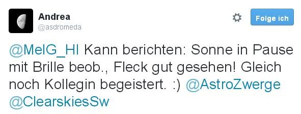 Auch mit der Sonnenfinsternisbrille war der Fleck für uns sichtbar, aber man musste schon sehr genau hinsehen bzw. leicht an ihm vorbei sehen, um ihn zu erkennen. Und natürlich hieß es schneller als die Wolken zu sein.