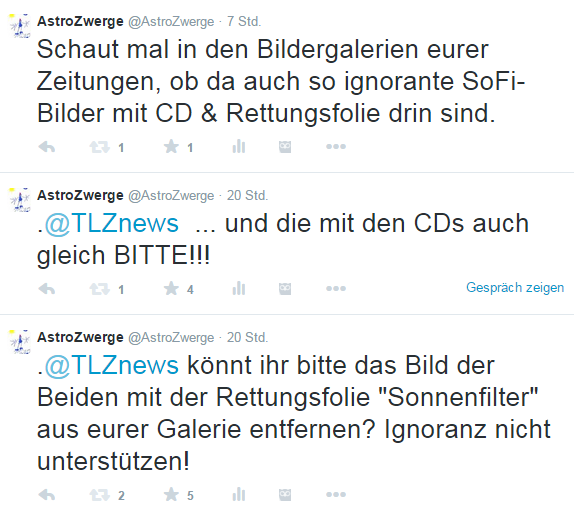 Beim Googlen nach „Sonnenfinsternis Rettungsfolie“ fanden wir nun etliche Seiten, die diese Beobachtung als harmlos darstellten oder sogar Argumente dafür auflisteten.