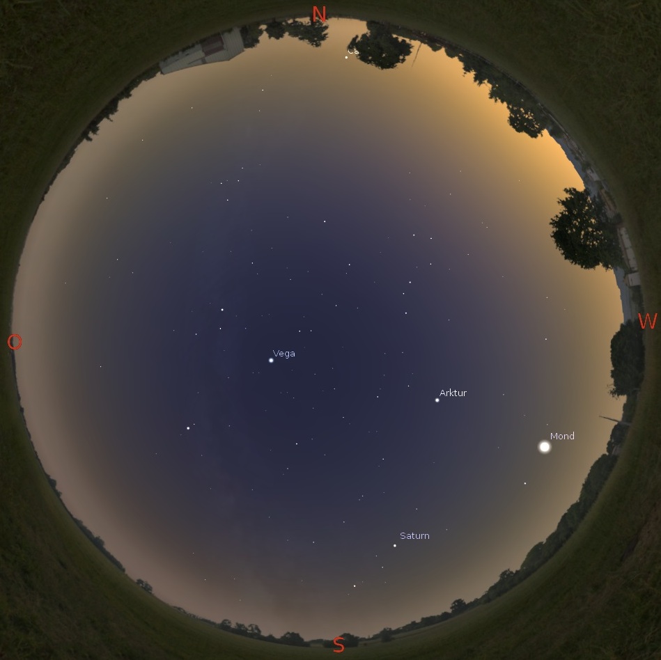 Während des Urlaubs wird am Donnerstag Neumond sein. Somit geht er erst als abnehmender Mond gegen 2¾ Uhr im Ostnordosten auf, um einige Tage später kurz nach Sonnenuntergang zu verschwinden.
