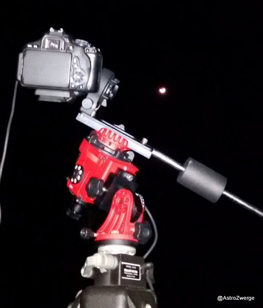 Die Ausrüstung steht bereit. Wir wollen mit dem 200 mm Objektiv und dem kleineren fotografieren und durchs Fernglas schauen. Das Fernrohr bleibt im Keller.  Das große Objektiv hab ich auf die Star Adventurer geklemmt, da brauch ich dann nicht ständig nach dem Mond suchen 😉 Also, los geht’s!