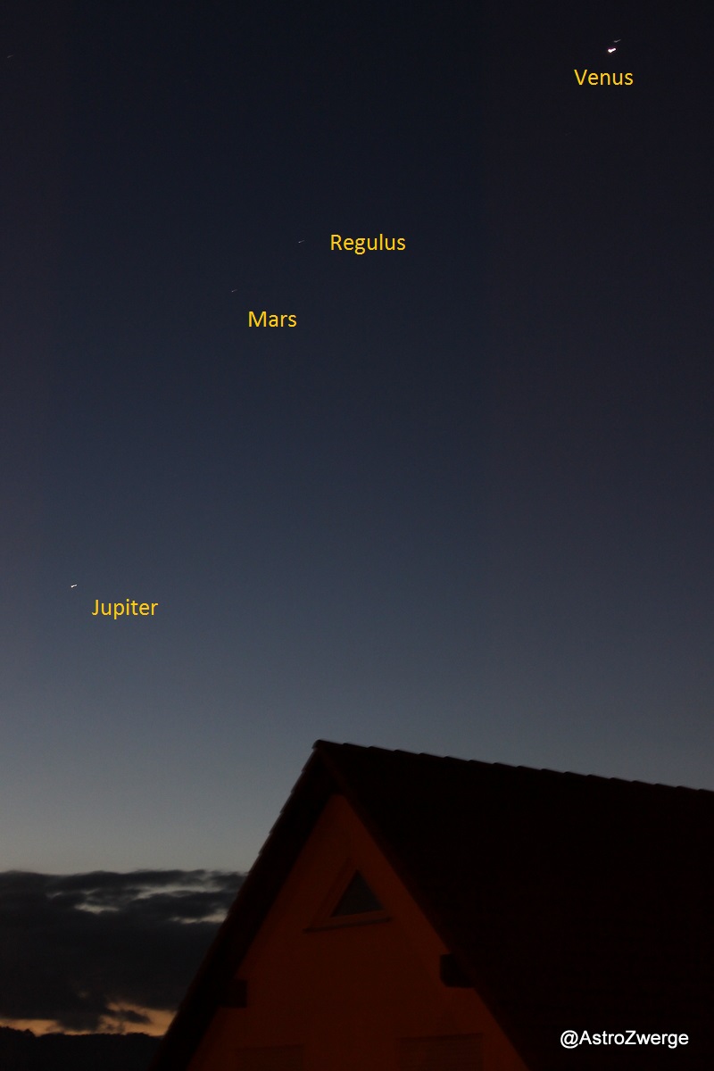 Ich hab mich sogar noch mal kurz hingelegt. Schlafen war zwar nicht, aber in die Bettdecke kuscheln tat auch sehr gut. Beim Blick aus dem Küchenfenster waren die Wolken wieder weg und Jupiter, Mars, Regulus und Venus begrüßten mich. Der Schnappschuss aus der Hand verwackelte leider etwas, aber schön war es anzusehen.