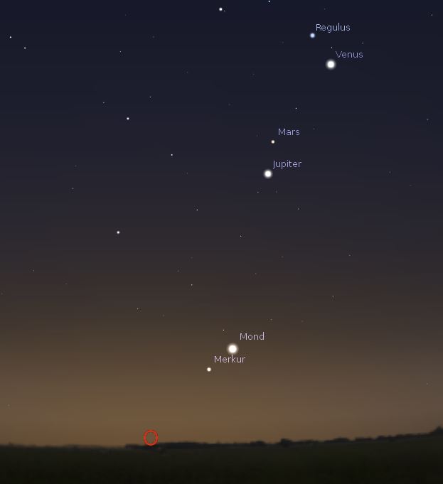 Planeten und Sterne werden mitten in der Stadt durch die Häuser und das viele zusätzliche Licht schwer zu erkennen sein. Und bestimmt wachen wir nicht rechtzeitig genug auf, um den Planetenreigen (Merkur – Jupiter – Mars – Venus) frühen Morgen bewundern zu können.