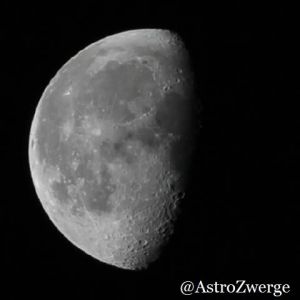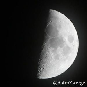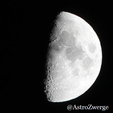 Nach fast 5 Tagen ist der Mond zu 1/4 beleuchtet. Wenn die Sonne unter geht befindet sich der Mond noch in Richtung Süd-Süd-West. Er selber geht dort jetzt erst gegen Mitternacht, also 2 1/2 Stunden später unter.