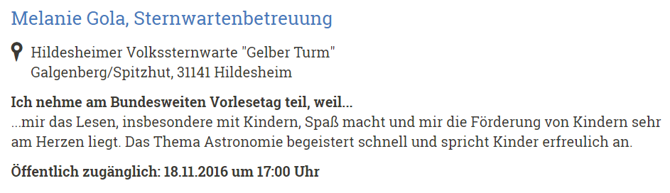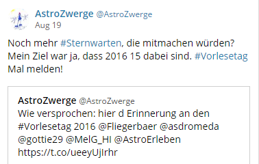 So, wenn ich jetzt noch was vergessen habe, gebt mir Bescheid. Ich trage es dann noch hinterher nach. Schließlich ist es mein Ziel, dass 15 Sternwarten am bundesweiten Vorlesetag mitmachen. Seid ihr dabei?