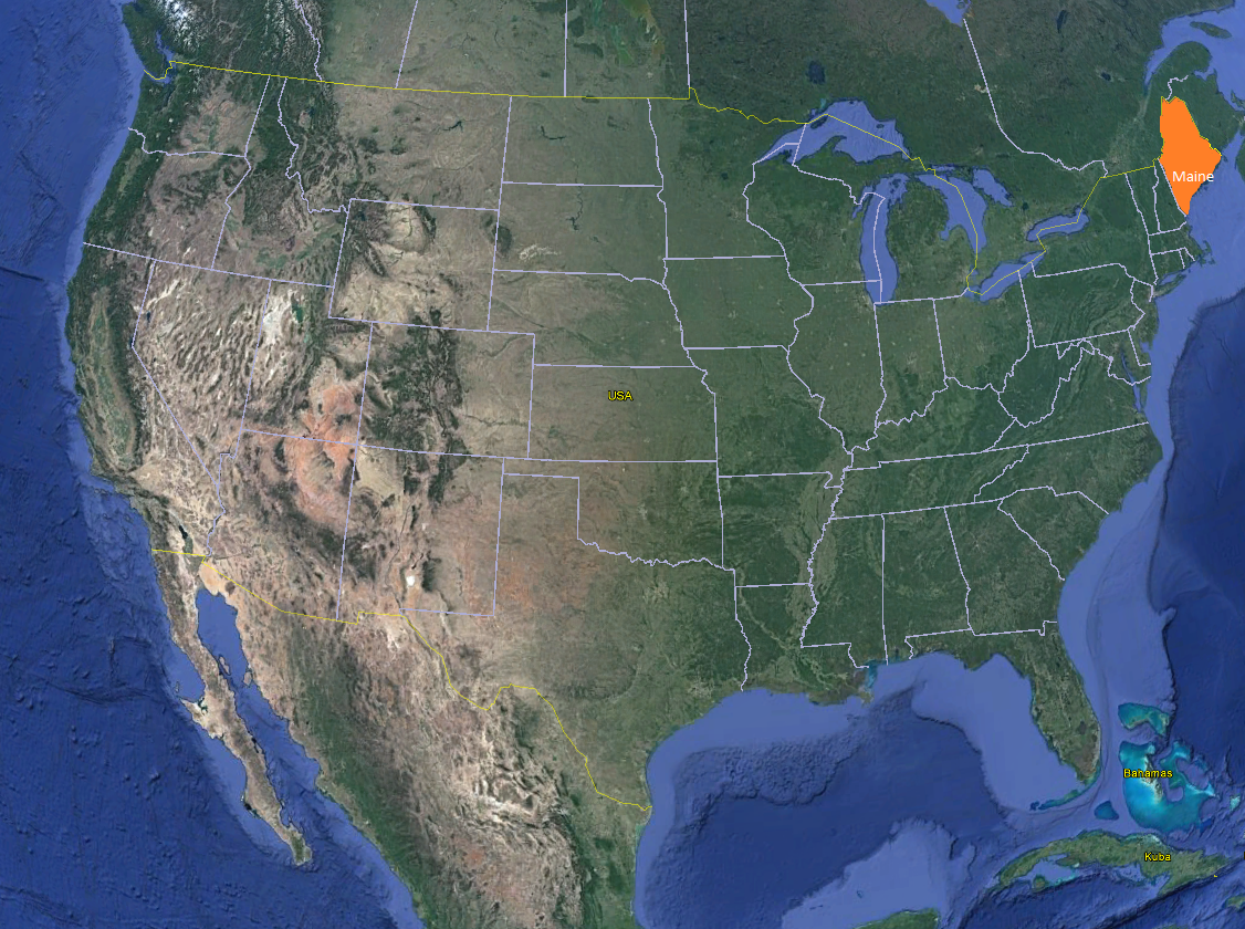 Von Massachusetts aus fuhren wir mit dem Leihwagen nach Norden kurz durch den Bundesstaat New Hampshire in den Staat Maine. Dieser Bundesstaat hat ungefähr ein Viertel der Fläche von Deutschland, es leben hier aber nur 1,3 Millionen Menschen (Deutschland ca. 82 Mill.) Vor allem gibt es hier Wälder, Seen, NATUR … So richtig um Ferien (engl. vacation) zu machen. Und das richtige Wetter hatten wir auch dafür.