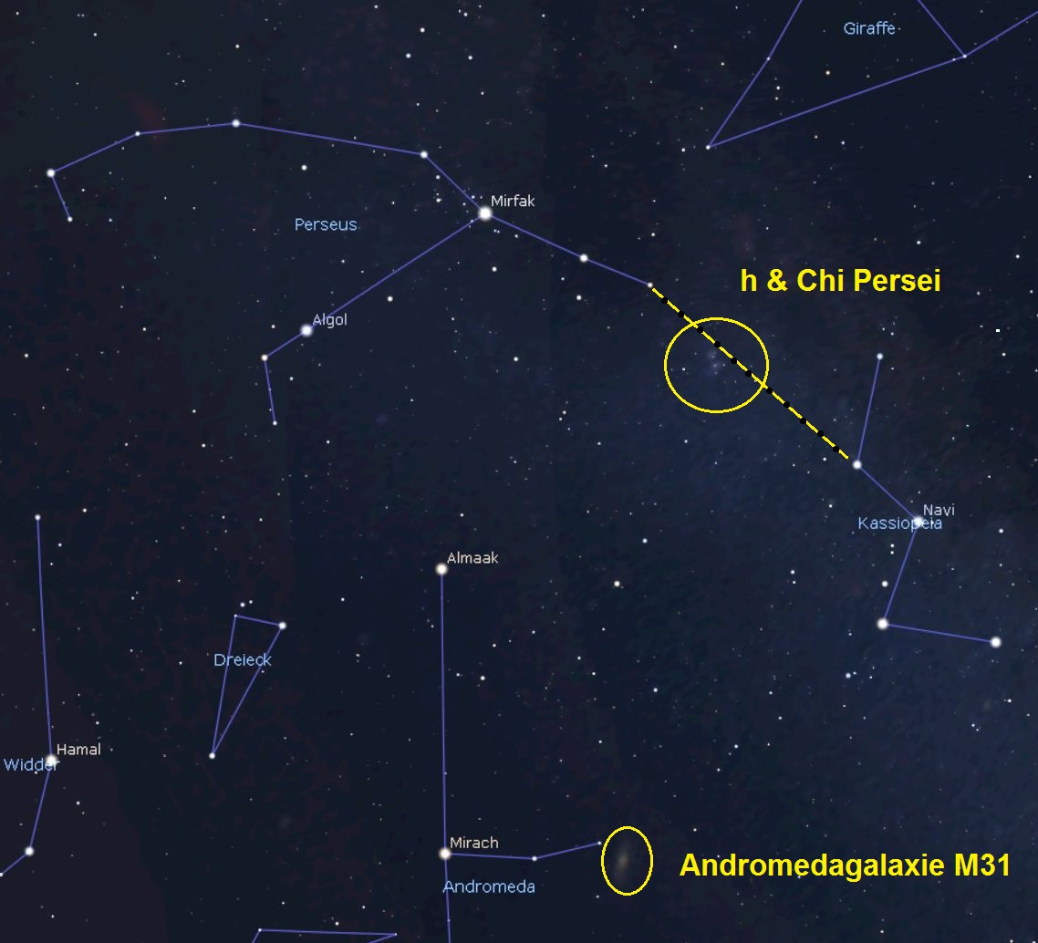 Der Doppelsternhaufen h + Chi Persei liegt zwischen den Sternbildern Kassiopeia (Himmels-W) und dem Perseus. Die Sternhaufen sind aber auch nur ganz schwach zu sehen. Wenn ihr sie nicht gleich findet, dann schaut am besten zuerst mit dem Fernglas.