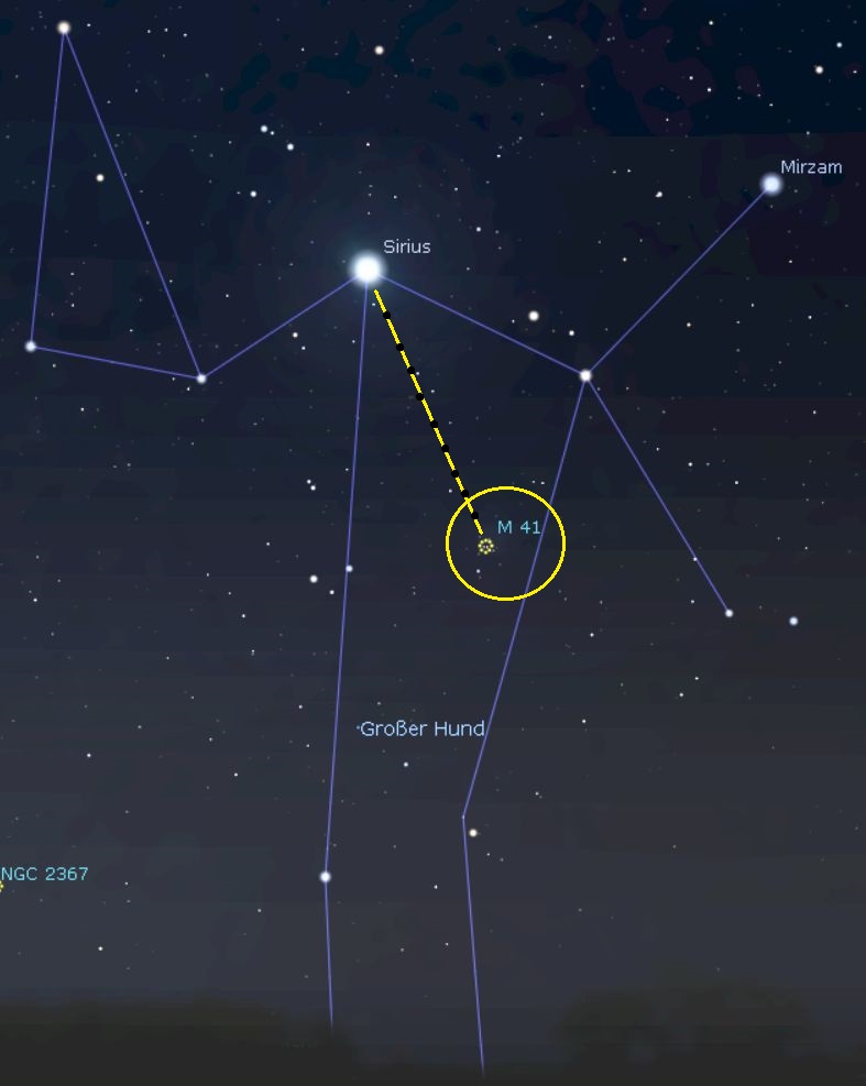 Etwas schwieriger zu finden war M41. Das ist ein offener Sternhaufen im Sternbild Großer Hund. Als erstes habe ich Sirius mit meinem Fernglas gesucht. Den müsst ihr euch unbedingt angucken, weil er so schön in allen Farben leuchtet. Außerdem ist Sirius der hellste Stern am Himmel. Den werdet ihr ziemlich leicht am Himmel finden. Der Sternhaufen M41 liegt etwas unterhalb von Sirius. Er ist als matschiger Fleck sehr deutlich im Fernglas zu sehen.