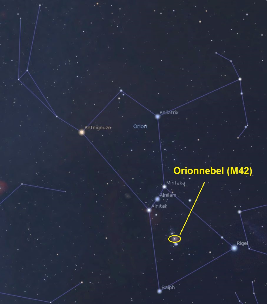 Dass ich so viele Sachen an einem Abend beobachtet habe ging nur deshalb, weil ich meine Mutter zur Unterstützung hatte. Wenn ich ehrlich bin, hätte ich wahrscheinlich nur die Plejaden und den Orionnebel ganz alleine gefunden. Ich würde mich freuen, wenn auch ihr einmal versuchen würdet, eines der Objekte am Himmel zu finden. Gebt doch mal Bescheid, ob es geklappt hat. Das wäre echt toll! Meine Objekte habe ich von leicht nach schwer aufgeschrieben. Damit auch ihr eines der Objekte am Himmel finden könnt, haben wir euch noch aus dem Programm Stellarium die Sternbilder kopiert und die Objekte eingezeichnet. Sie sollen euch beim Suchen helfen.