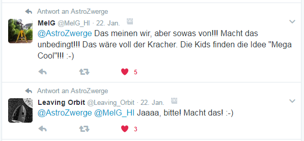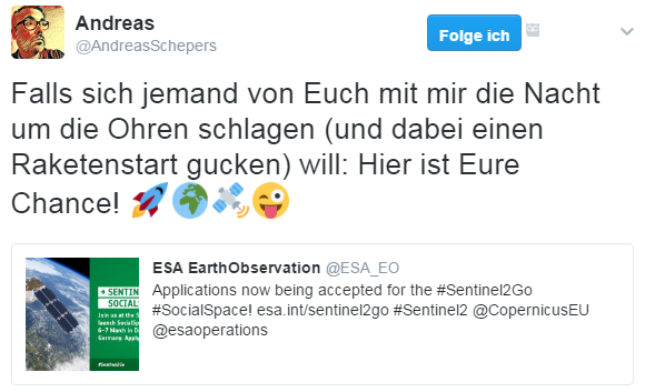 Etwas später stellte sich dann heraus, dass sich auch @Paxi_ESAKids, @Mausonaut und @markonebravo (und viele, viele mehr) beworben haben. Auch Remco Timmermans hat sich beworben. Wisst ihr noch; er hatte uns auf die Idee mit dem Projekt #11vor11 gebracht. Wäre doch wirklich eine lustige Runde.