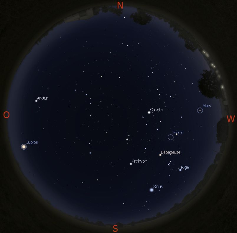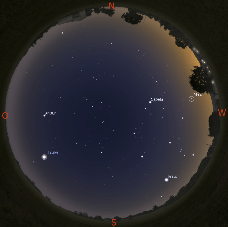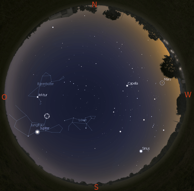 Die Wintersternbilder Zwillinge, Fuhrmann, Orion, kleiner und großer Hund sowie Stier verschwinden nun langsam.