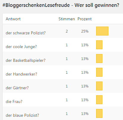Ursprünglich wollten wir ja via Twitter abstimmen lassen, da wir hier mehr Teilnehmer erhoffte. Bei Twitter kann man jedoch nur 4 Möglichkeiten zur Verfügung stellen. Eindeutig zu wenige für die 11 Teilnehmer. Am Ende haben 8 von euch ihre Stimme abgegeben und den schwarzen Polizisten