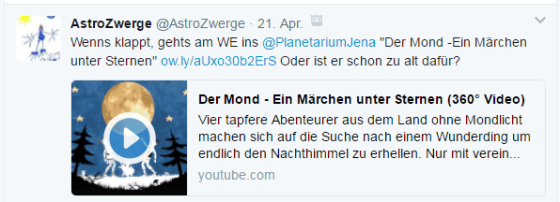 Ich muss ja gestehen, das Märchen „Der Mond“ kannte ich bisher gar nicht. Aber sehr schön erzählt und gemacht. Scherenschnittartige Animationen mit vielen lustigen Einfällen ließen überall Neues entdecken und die Augen über die gesamte Planetariumskuppel wandern. Im Prinzip ein bewegtes, sich ständig änderndes (aber nicht unruhiges) Wimmelbild. Die Geschichte ist sehr kurzweilig und wird zusätzlich aufgelockert, indem die zuschauenden Kindern aufgefordert werden, den tapferen Abenteurern zu helfen. Spannung, ein klein wenig Grusel, Musik, Romantik und Unterhaltung wechseln sich gut ab und lassen eine gelungene Veranstaltung entstehen.