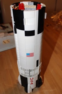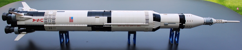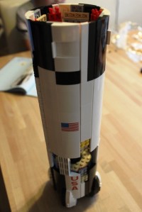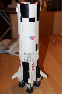 Nun konnten Stufe 1 und Stufe 2 verheiratet werden. Weiter geht es mit der 3. Stufe, der Instrumenteneinheit, der Mondlandefähre, dem Apollo Servicemodul, dem Apollo-Kommandomodul und der Rettungsrakete. Für die Mondlandefähre gibt es noch extra eine Mondfläche mit amerikanischer Flagge und für das Kommandomodul eine Wasserfläche. Außerdem dürfen natürlich aich die 3 Astronauten Neil Armstrong, Michael Collins, Buzz Aldrin nicht fehlen.