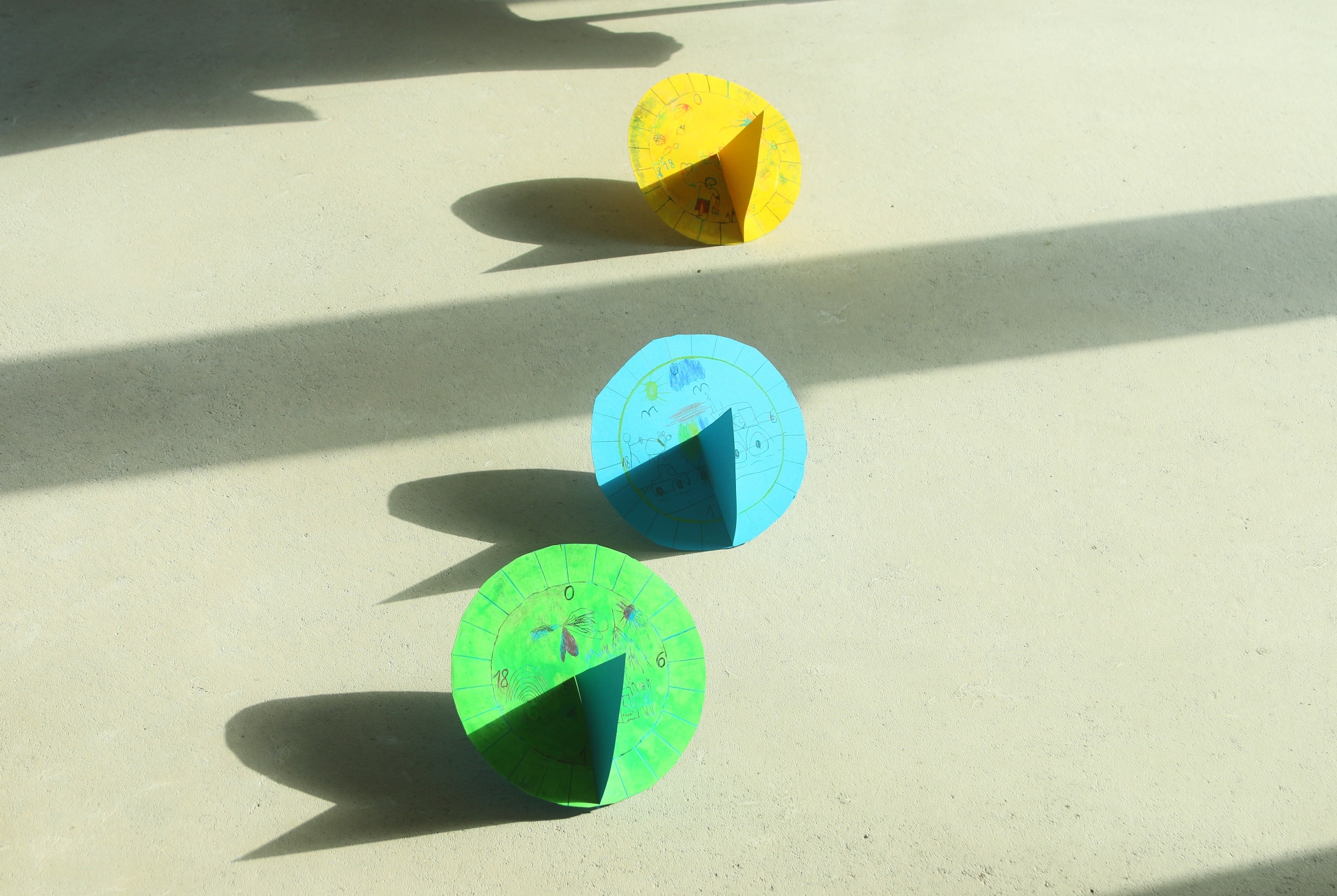 Schaut mal, Robin und ich haben Sonnenuhren mit Kratztechnik gebastelt. Bei uns in Hildesheim, an einer Schule in der Kesslerstraße, gibt es nämlich eine Sonnenuhr mit Kratztechnik. Das heißt dann Sgraffito. Wir haben die Sonnenuhr noch nicht besucht, werden sie aber noch besuchen und euch Bilder schicken. Die Bastelei war viel Arbeit. Tim hat seine Sonnenuhr mit Buntstiften bemalt. Jetzt müssen wir nur noch beobachten, ob auch alles richtig funktioniert.