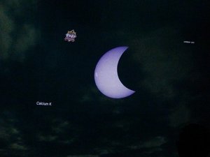 Mit Hilfe der Planetariumstechnik wurde die kommende Sonnenfinsternis dargestellt und erklärt, wie sie entsteht. Es wurde der Zusammenhang mit der Sonnenfinsternis 1999 in Deutschland besprochen – wusstet ihr, dass ähnliche Sonnenfinsternisse im Abstand von 18 Jahren und knapp 11 Tagen zu erleben sind? (*) Es wurde eine eine Animation aus Bildern von G. Helmer (dem Vortragenden) der Sonnenfinsternis von (Mist, wann war die?) vorgeführt. Dabei waren der Diamantring (**) und Protuberanzen (***) sehr gut zu sehen. Zwischendurch gab es Live-Bilder aus dem Internet zur aktuellen Bedeckung in Nashville.