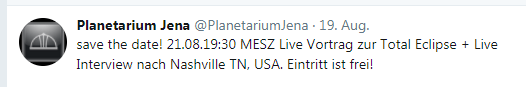 Wie in der letzten Woche angedeutet , waren wir am Montag im Planetarium in Jena, um uns die Sonnenfinsternis von dort aus anzusehen. Es war ein Vortrag mit Live Interview nach Nashville in Tennessee direkt während der Sonnenfinsternis dort angekündigt.