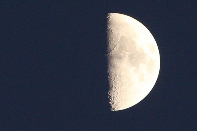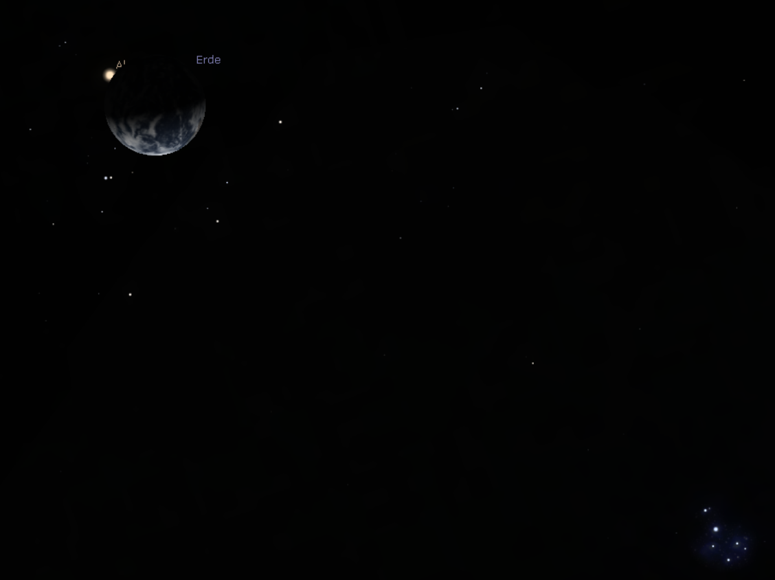 Aldebaran ist nicht zu sehen, der Mond steht hoch oben am Himmel. Auch mit dem Fernglas ist er nicht zu erkennen.
