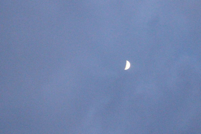 Es ist dunkel geworden. Der Mond steht etwas niedriger. Das Fotografieren wird nun etwas schwieriger, da ich nicht genau weiß, wie ich den Apparat optimal einstelle, damit der Mond nicht alles überstrahlt und Aldebaran trotzdem zu sehen ist. Wieder „läuft“ der Fotoapparat und ich beobachte durchs Fernglas. Auch diese Beobachtung wesentlich schwieriger, da der Lichtpunkt nicht einfach plötzlich da ist, sondern er sich hinter dem hellen Mondrand hervor schiebt.
