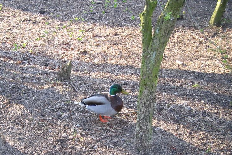 Ente watschelt über braune Erde , kleine Blätter an den Zweigen