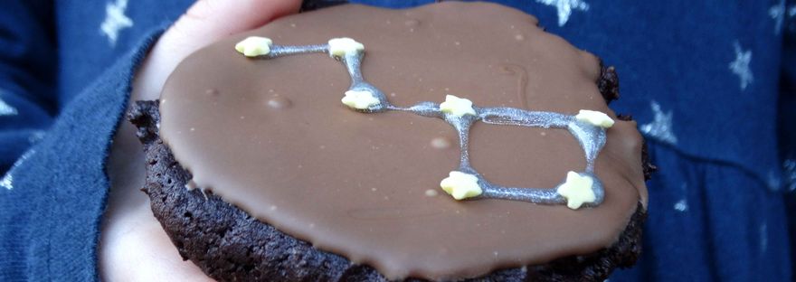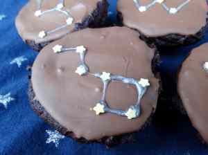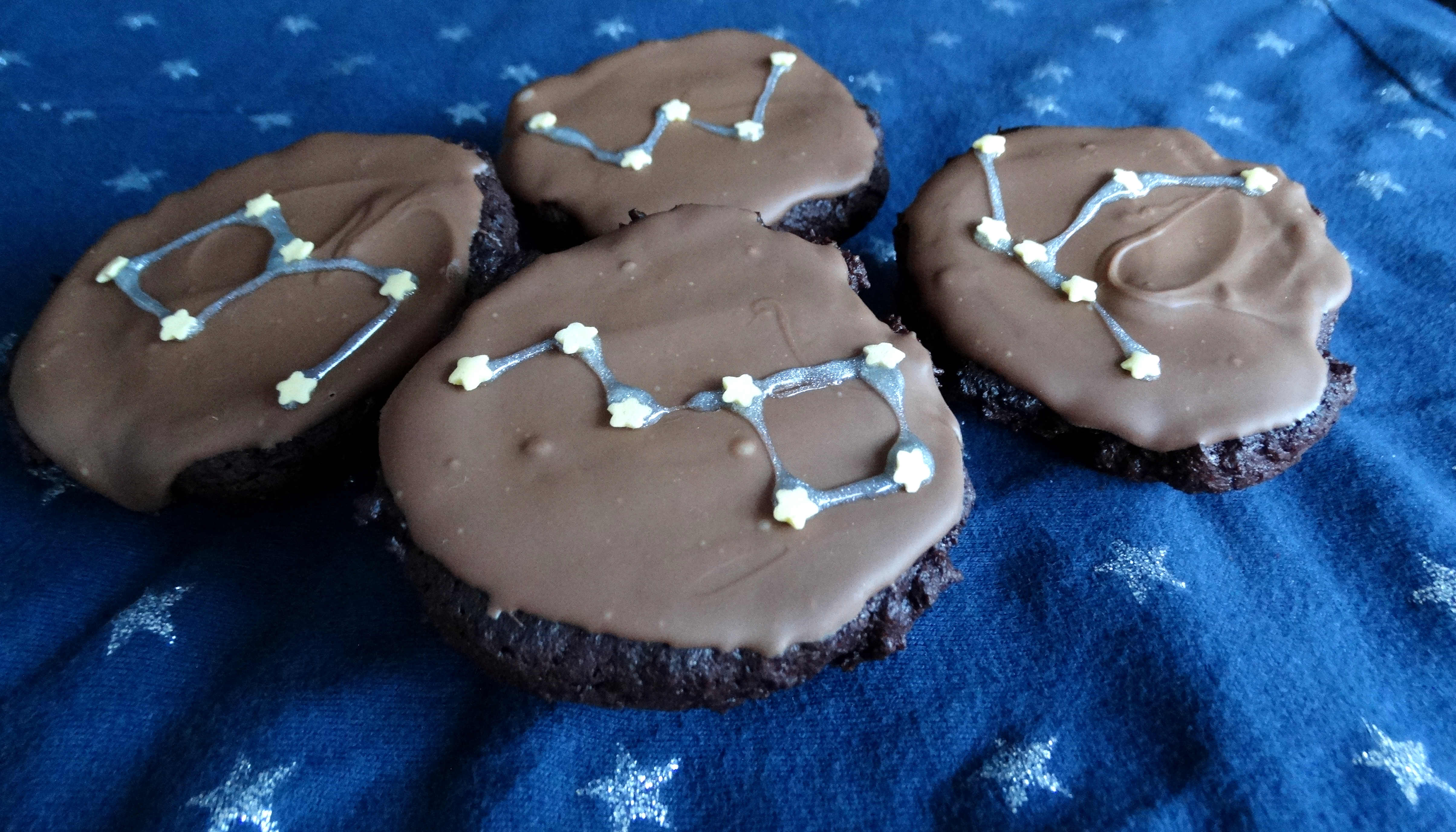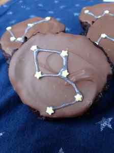 - Die Schokolade wieder ein bisschen abkühlen lassen, sodass sie nicht sofort von den Amerikanern herunter läuft. Wer mag, kann sie auch in einen Spritzbeutel mit kleiner Tülle füllen. Die Amerikaner damit auf der Unterseite bestreichen und auf einem Gitter so hinlegen, dass sie Schokolade ganz leicht antrocknen kann. Dann die Sterne darauf nach euern liebsten Sternbildern anordnen.