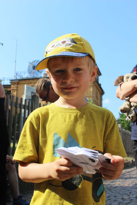 Überpünktlich und aufgeregt erschienen 11 angemeldete Kinder mit ihren Eltern und 2 spontane Erwachsene an der Eingangspforte zur Volkssternwarte Urania Jena. Da der Platz in der Sternwarte ziemlich begrenzt ist, bleiben wir einfach im Schatten auf dem Weg und los ging es. Einige der Kinder hatten den Start schon im Fernsehen gesehen und die meisten kannten mindestens eine der Maussendungen mit Alexander Gerst. Die Kinder hatten im Vorfeld eine Mail mit einer ihnen zugewiesenen Aufgabe (siehe Informationen zur Kinderveranstaltung ) bekommen.