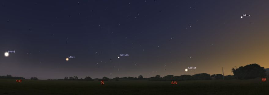 Knapp über dem Horizont steht ein weiterer besonders heller Lichtpunkt. Diesmal ist es aber kein Stern. Nein, der Planet Jupiter lugt über den Rand. Der fünfte Planet in unserem Sonnensystem ist ein großer Riese aus Gas. Lange ist er nun aber nicht mehr am Abendhimmel zu sehen.