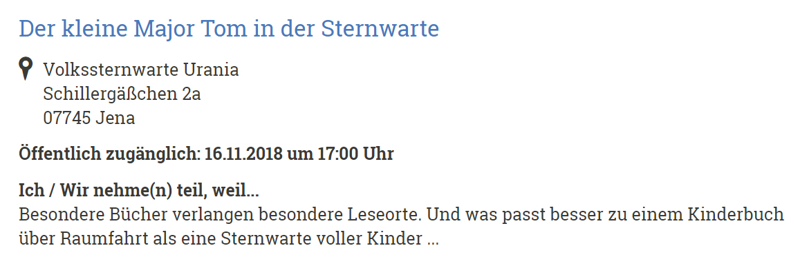 Übrigens habe ich doch von der Zielstellung „10 Sternwarten beim Vorlesetag“ Abstand genommen. Trotzdem würde es mich freuen, wenn noch mehr mitmachen und sich bei uns melden.