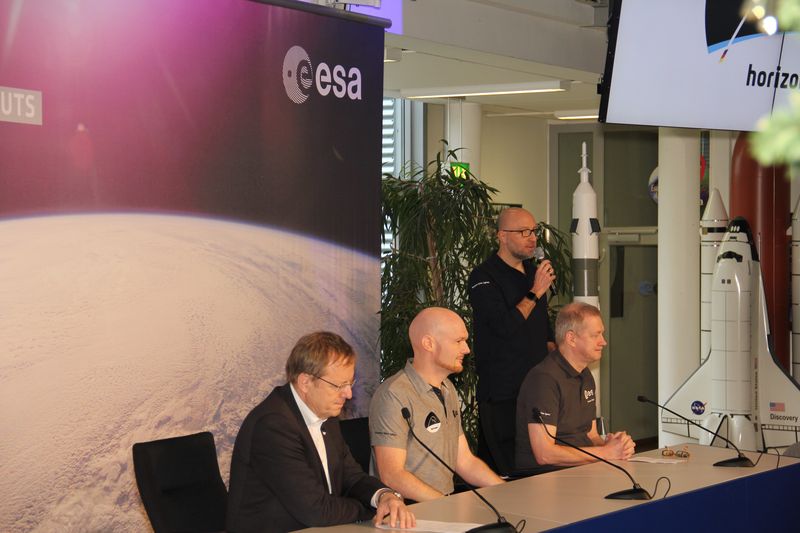 Frank de Winne (Leiter des EAC) und Jan Wörner (Chef der ESA) begrüßen Alexander Gerst. Er winkt mir sogar zu, zeigt mir den Daumen und sagt „Super!“.
