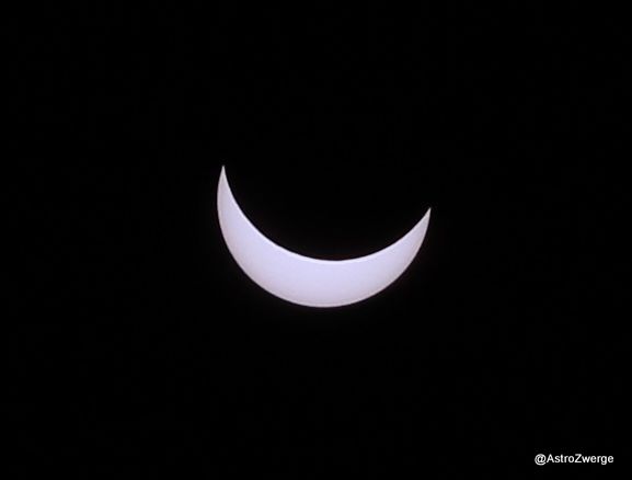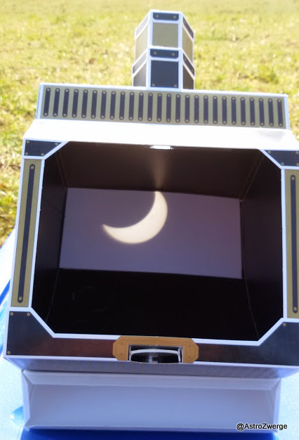 Die Kinder, „die waren begeistert (altersentsprechend haben die kleinsten mal kurz geschaut, die großen richtig mitgefiebert); meine erinnern sich bis heute gut, auch an die Dämmerung bei der maximalen Bedeckung etc.und durch die Konstruktion konnten wir auch kleine problemlos beobachten lassen, ohne irgendwie mit Brillen und Zeug anzufangen.“ und so sahen die Bilder dabei aus: