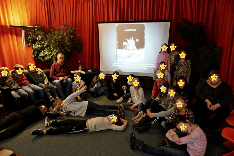 Der Vortragsraum war wieder voll mit 12 Kindern und ihren Eltern. Erst las der „Zwerg“ mit „Bildunterstützung“ aus dem Buch „Armstrong“. Dann spielten wir die Apollo 11 Mission mit unseren Lego-Modellen nach und zum Schluss gab es den üblichen Blick durch das Teleskop auf die Schrift vom Jentower.