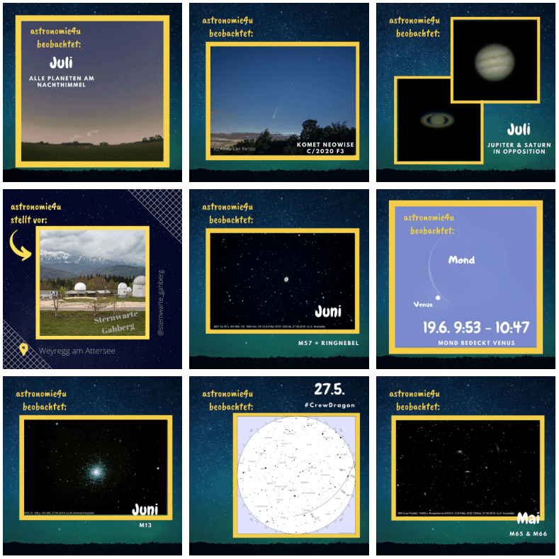 Ursprünglich wollte ich das mit Astronomie.de zusammen gestalten, leider scheiterte das jedoch an Kapazitäten. So wurde am 12. April der Instagram-Kanal „astronomie4u“ gestartet.