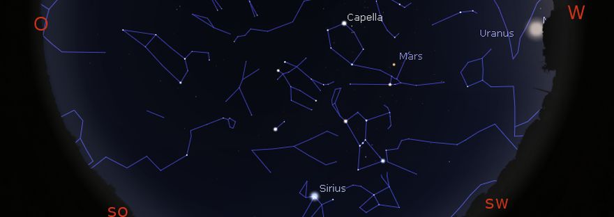 Der Mars ist am Abendhimmel im Südwesten zu sehen und zieht zum Monatsbeginn durch das Goldene Tor der Ekliptik.