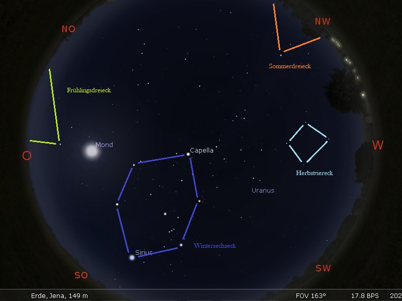 Das Sommerdreieck aus Deneb (im Sternbild Schwan) – Wega (in der Leier) und Altair (im Adler) ist nur noch teilweise im Nordwesten zu sehen. Das kleinere Herbstviereck steht im Westen. Das große Wintersechseck zeigt seine ganze Pracht im Süden und auch das Frühlingsdreieck lugt sich schon über dem Osthorizont hervor.