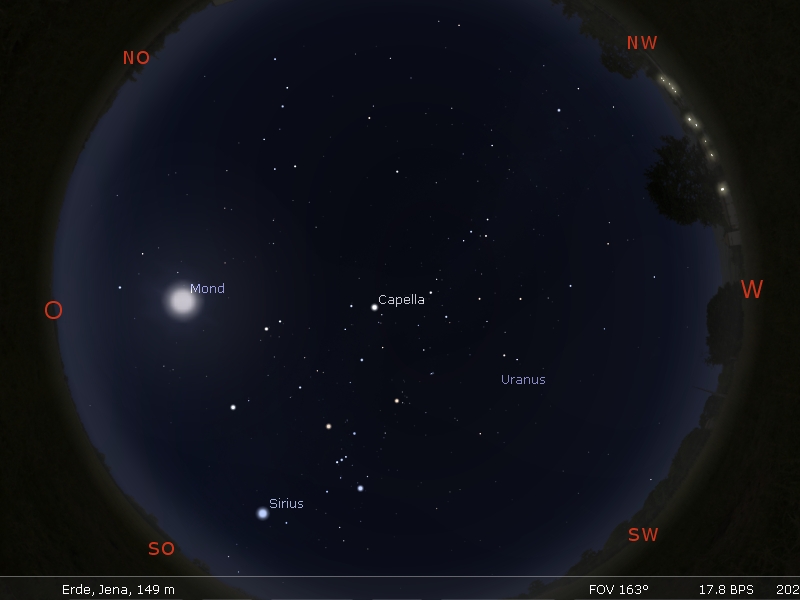 Das Sommerdreieck aus Deneb (im Sternbild Schwan) – Wega (in der Leier) und Altair (im Adler) ist nur noch teilweise im Nordwesten zu sehen. Das kleinere Herbstviereck steht im Westen. Das große Wintersechseck zeigt seine ganze Pracht im Süden und auch das Frühlingsdreieck lugt sich schon über dem Osthorizont hervor.