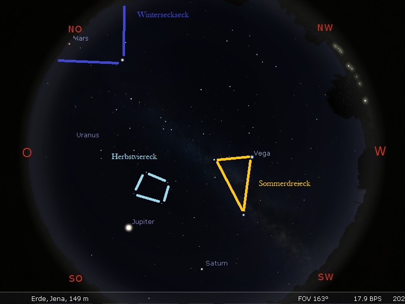 Das Sommerdreieck aus Deneb (im Sternbild Schwan) – Wega (in der Leier) und Altair (im Adler) steht südwestlich über uns. Das Herbstviereck aus den vier Sternen Algenib, Scheat, Markab und Sirrah zieht immer deutlicher in den Süden.