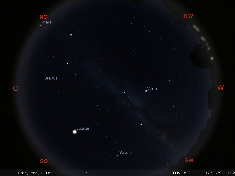 Saturn ist noch vor Jupiter sichtbar, aber nicht so leuchtstark und nicht so hoch.