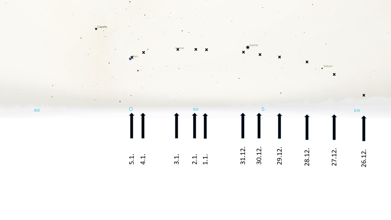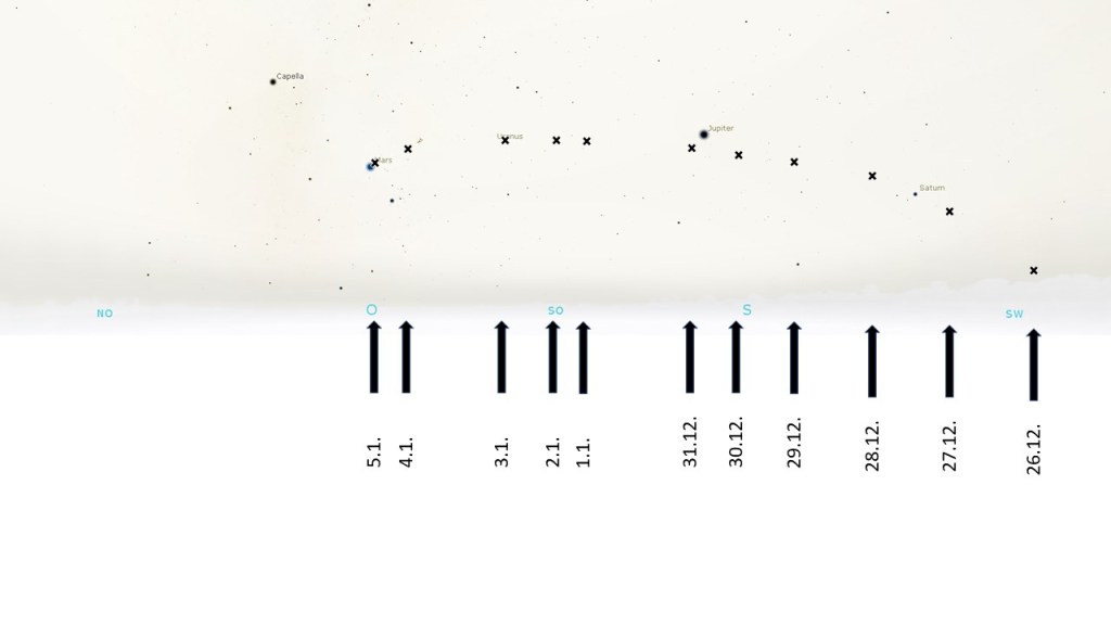 | 21.12. | 6:15 Uhr | Süd-Ost | fast Neumond (23.12.) |