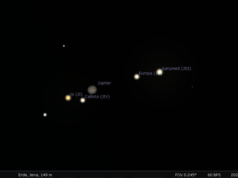 Während der Beobachtung der Mondfinsternis, kann man ja noch einen kleinen Schwenk nach rechts unten machen und Jupiter betrachten.
