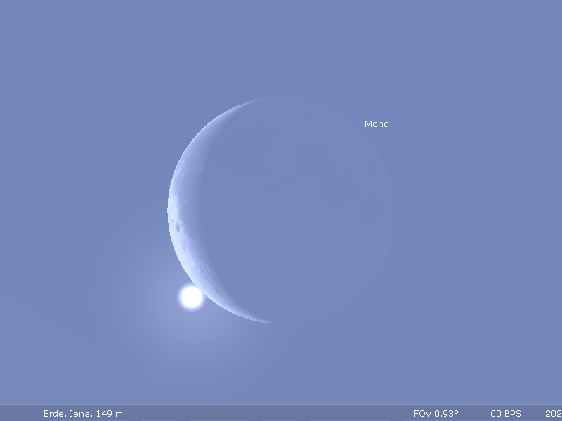 Abhängig vom Beobachtungsort schiebt sich der Mond ab ungefähr 10:45 Uhr vor die Venussichel, bis sie dann gegen 12 Uhr wieder auf der anderen Seite auftaucht.