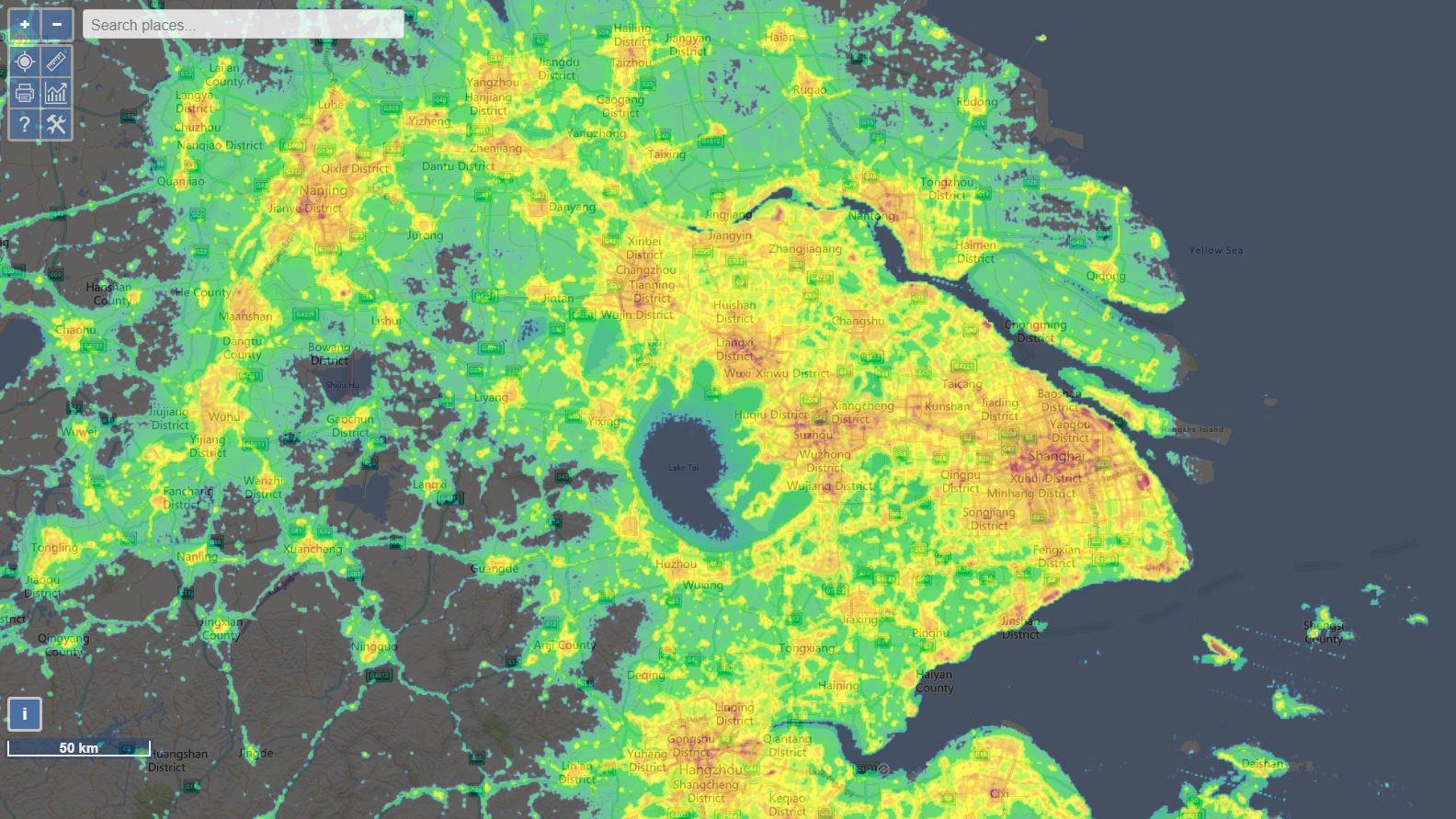 Ich hab hier mal die grafische Darstellung der Lichtverschmutzung von www.lightpollutionmap.info von Jena und Shanghai nebeneinander dargestellt. Und während ich in Jena in einem der grünlichen Bereiche wohne, befindet sich das Hotel in einem eher rotem Bereich.